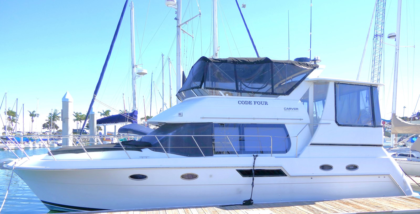 CODE FOUR has been meticulously maintained by the current owner who is a Boatyard Manager. In General, the Carver 406 Aft Cabin Motor Yacht is beautifully finished with teak wood cabinetry and Corian counters throughout. She has a wide-open interior with large windows which keep her light and airy. The spacious aft deck equipped with a refrigerator/ice maker and washer/dryer provides for even more comfort aboard.